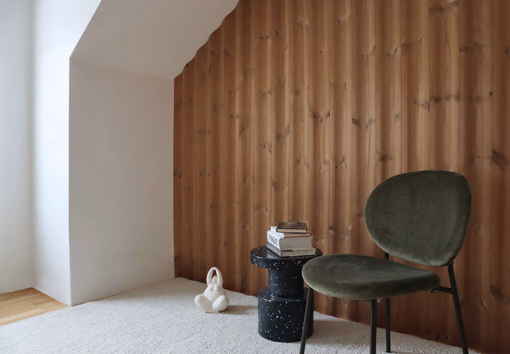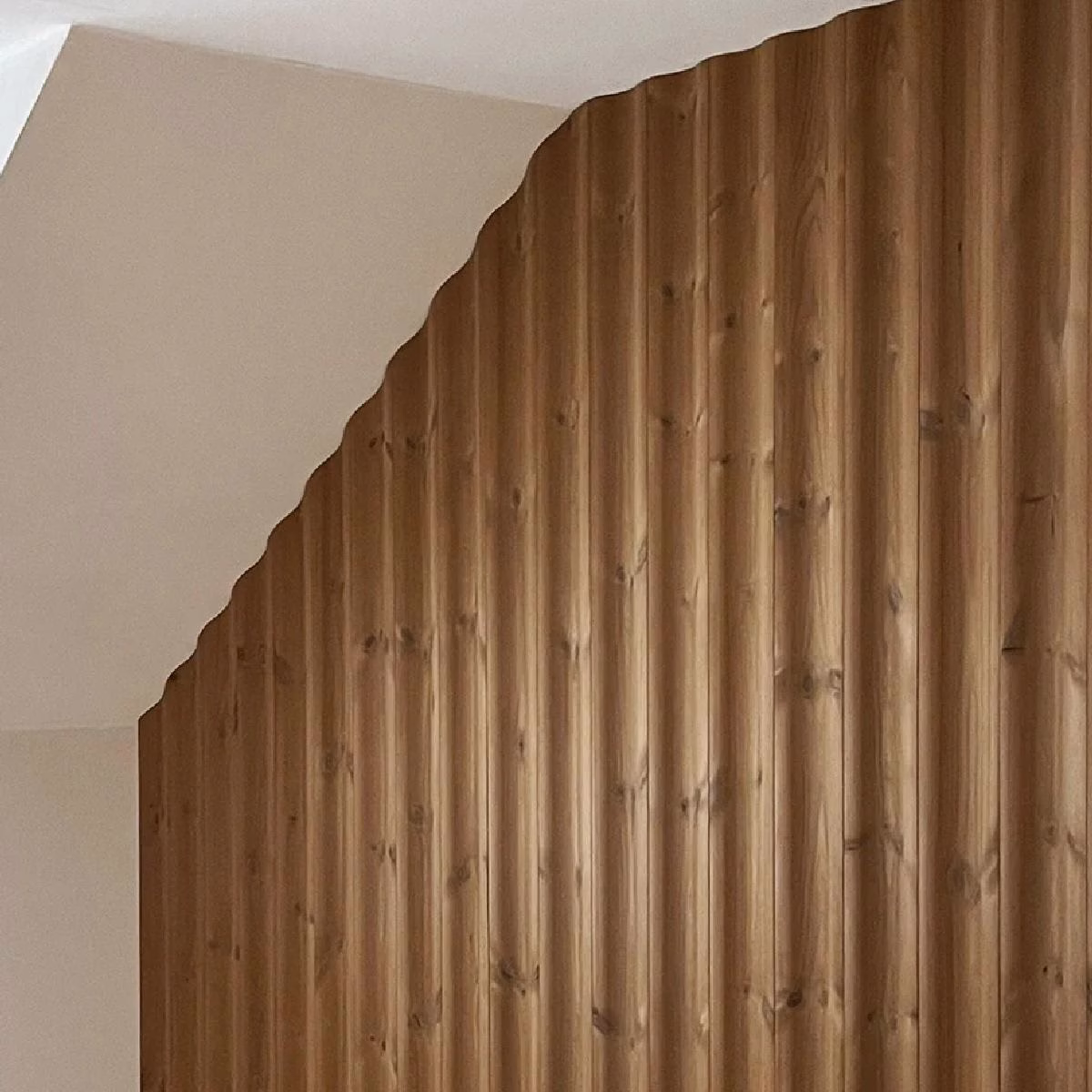 Paneles de madera natural termotradada, con superficie ondulada; su diseño orgánico nos hace pensar en agua que fluye. Las formas suaves del panel respetan los granos y nudos del pino nórdico. El montaje entre paneles es mediante machihembrado. Con estabilidad dimensional garantizada, son 100% libre de químicos, y aptos para ambientes interiores. Libres de resinas, aún a temperaturas altas. Imágenes © Lunawood