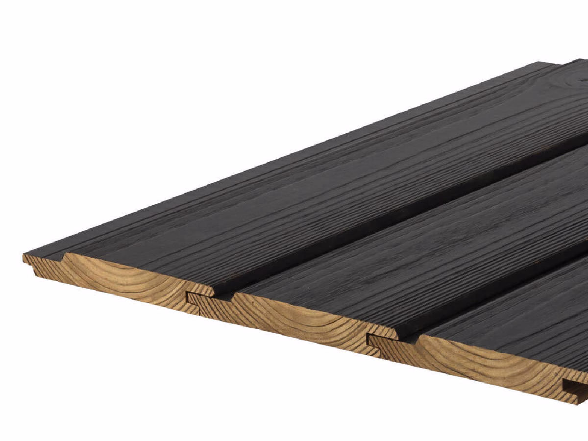 Paneles de madera natural termotradada, con superficie tratada con pintura especial de color negro mate, que proteje a la madera de la humedad, la luz del sol, el polvillo y las rajaduras. El montaje entre paneles es mediante machihembrado, con sistema de clavos ocultos. Con estabilidad dimensional garantizada, son 100% libre de químicos, y aptos para ambientes interiores. Libres de resinas, aún a temperaturas altas. Imáge