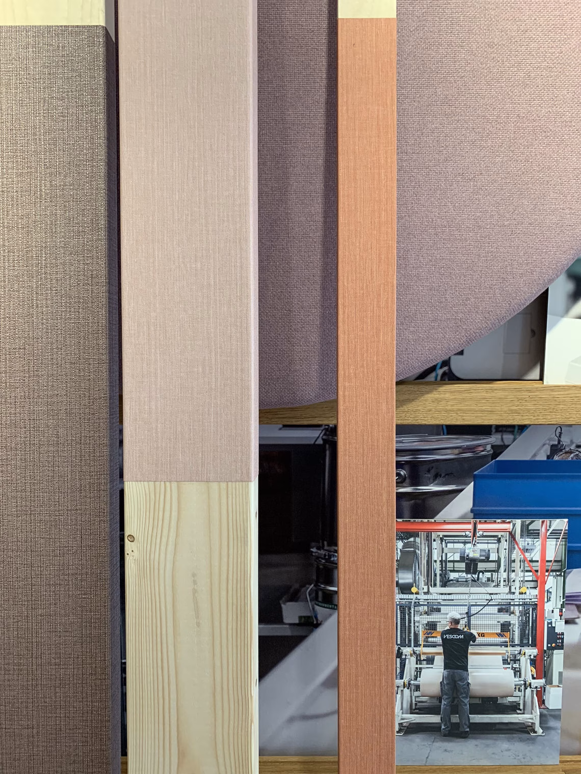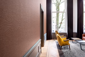 El revestimiento Vescom Ketoy consiste en una capa vinílica estampada con tintas al agua, calandrada sobre sobre una base textil de algodón. Tiene un diseño con estriado fino y orgánico y un sutil brillo, y está disponible con una paleta que contiene 23 colores.