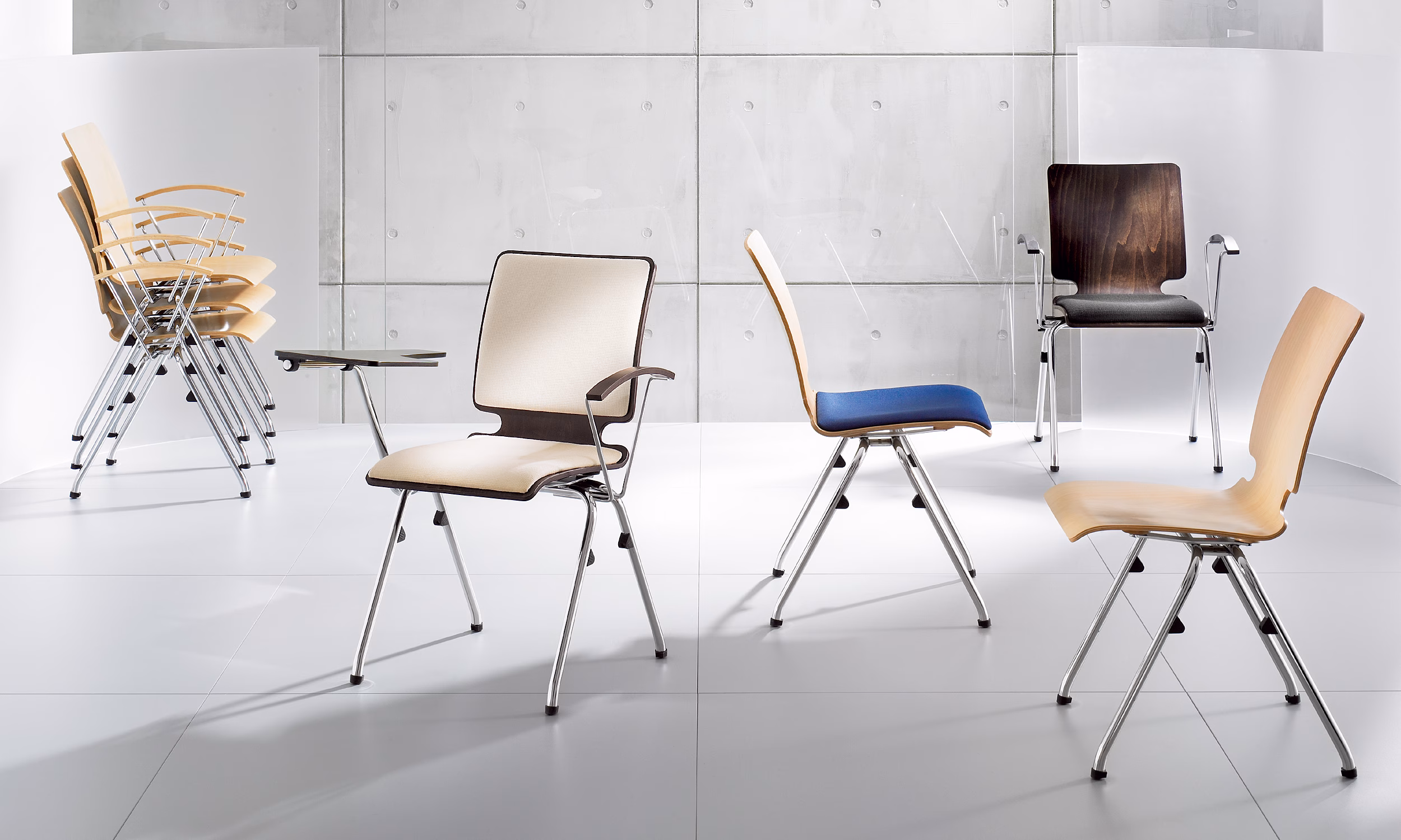 Axo de Nowy Styl es excepcionalmente fáciles de guardar, mover, o distribuir en cualquier espacio. Su diseño permite enganchar las Axo entre sí para formar filas en auditorios y salas de capacitación. La línea tiene tal variedad de modelos y funciones que cualquier sala de conferencias puede configurarse en seguida. Combina con las mesas plegables Delgado.