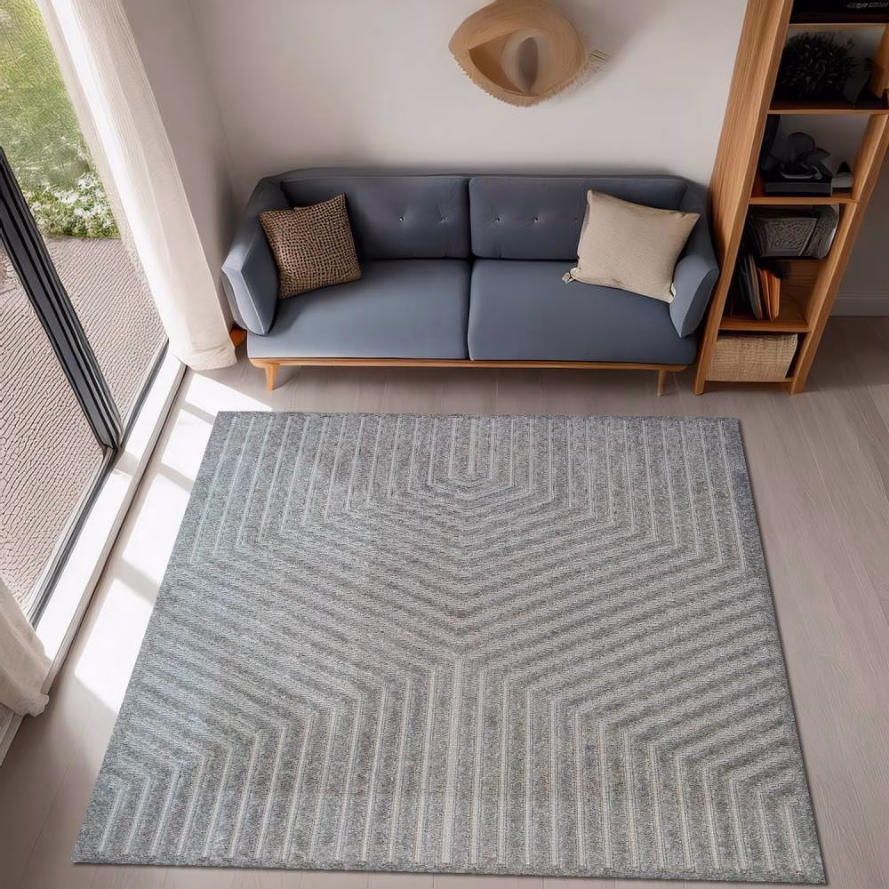 Diseño: Geométrico en relieve realizado en hilado sintético de alta calidad. Colores: Pelo cortado Ceniza sobre fondo pelo bouclé Gris claro. Tamaños disponibles: Medium (1.60 m x 2.35 m) y Large (2.00 m x 2.80 m). Base: Hilado natural Espesor: 7 mm Código de Colección: Chiara 54002 7V Colección Kalpakian Chiara: Alfombras que Transforman tus Espacios. Diseños modernos y colores en tendencia se combinan en estas alfombras de hilado sintético de alta calidad con base natural. Las texturas en pelo…