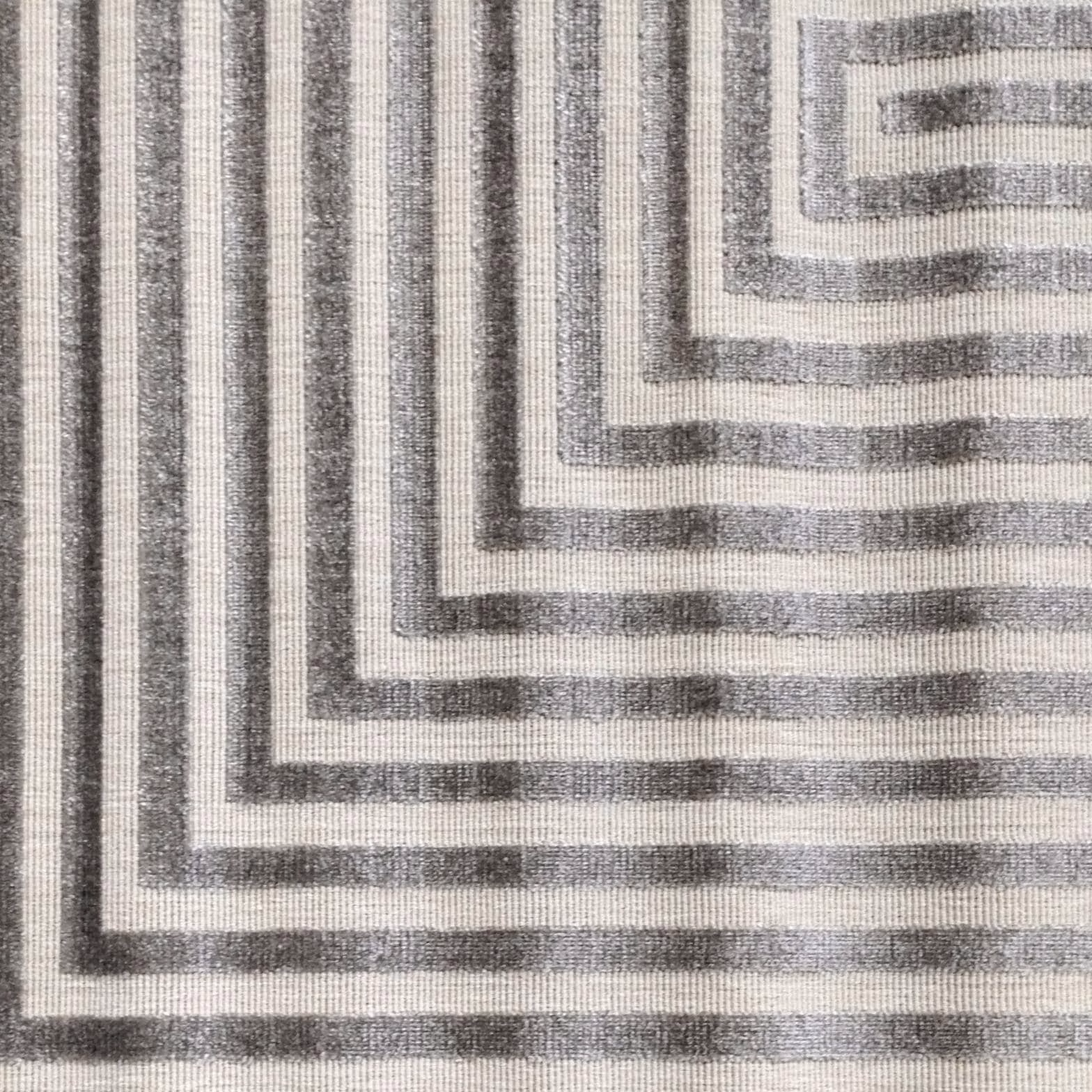 Fabricada con hilado 100% polipropileno, pelo bouclé en gama de grises.